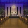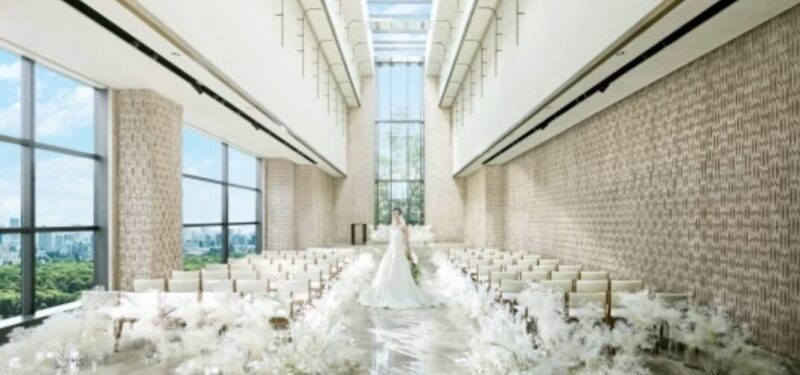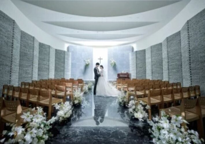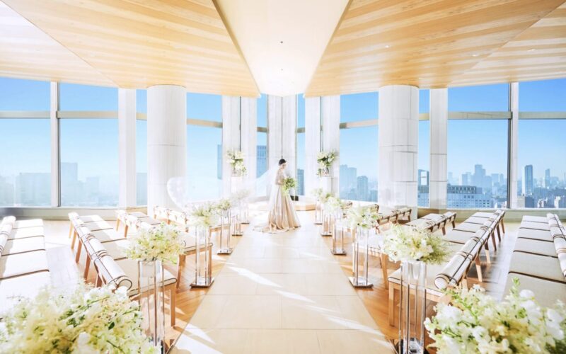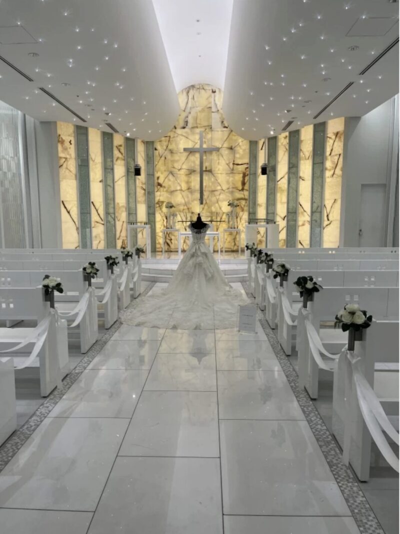 グランドチャペルとスカイチャペルの2つの会場があり、どちらも選択可能です。7階のグランドチャペルはイエローオニキスの石が使われており、チャペル全体が黄色の光に照らされ、とても暖かみのある空間を演出します。41階のスカイチャペルは白を基調とした会場で、窓があり自然光に照らされ、明るくてこちらもとても素敵です。さらにホテル内に社殿があり、神前式の3つからお好みの挙式会場を選べます。