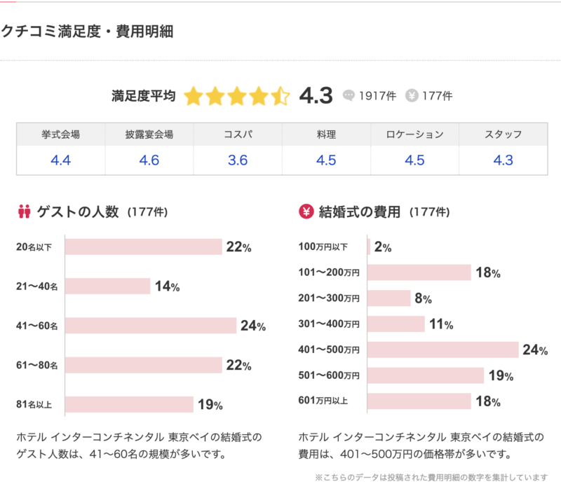 東京のホテルウェディングは「費用は高め・自己負担はやや多め」ですが、会場の多様性・アクセス・演出力、圧倒的なラグジュアリーが魅力。特に春と秋が人気シーズンで、高級ホテルは根強い人気を誇ります。ここまで来るとブランディングのお話になってきますので、それぞれの趣味趣向によって選ばれていくものだと考えています。3ーDAY Weddingなど当日だけではなく前日、当日、翌日をゆっくり滞在型の結婚式も増えてきています。口コミランキングを見ていても多様性、少人数などの対応も多く、満足度も高い傾向にあります。地方の方が多い方やホテルウェディングが憧れの方には選択肢も豊富で会場選びにはかなり悩まれるかと思いますが、自分らしいウェディングを叶えてくれるホテルは必ず見つけられるはずです。